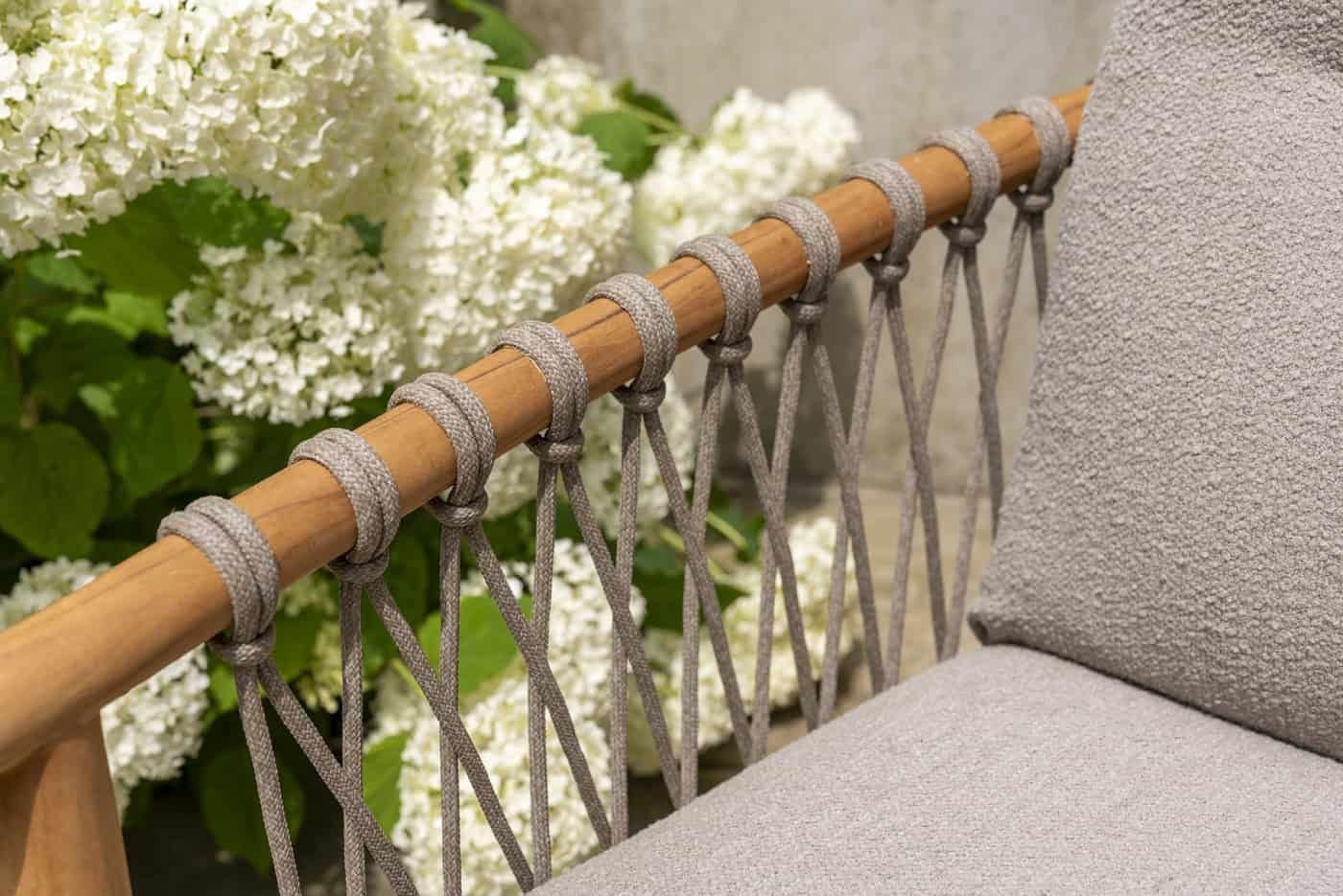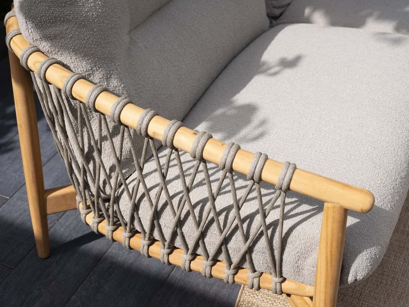 Natuurlijk, tijdloos design. De Nora serie is in veel opzichten van ongekende klasse. Prachtige rondingen in de teak frames zijn voorzien van een open rope patroon. We hebben dikke, zachte kussens met bouclé stof verwerkt die fantastisch comfort bieden.
