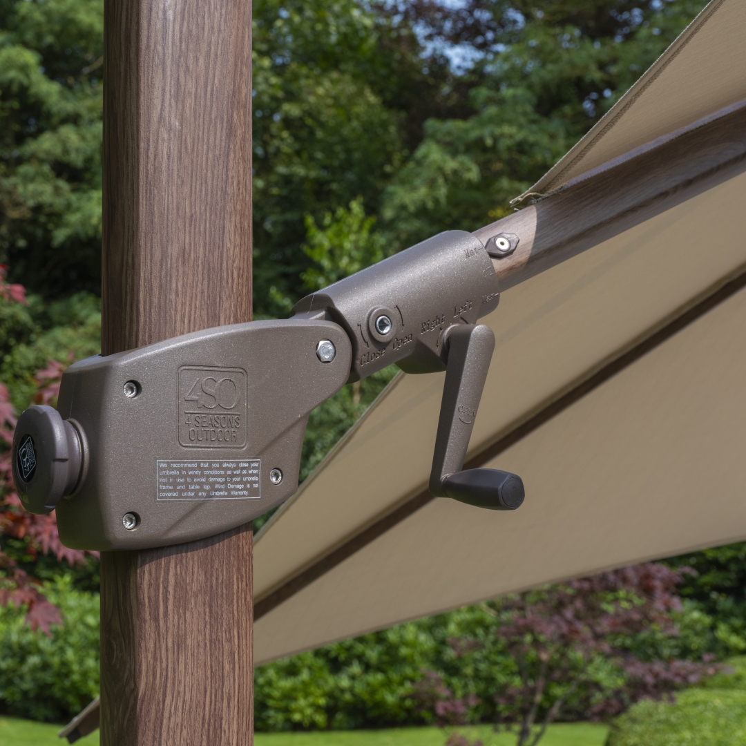 De vrijhangende parasol is makkelijk draaibaar op zijn parasolvoet door een pedaal, met een eenvoudige draaiknop kunt u de parasol richting het frame kantelen. Door met de hendel te draaien kunt u deze parasol ook nog beide kanten uit zwenken, in een extra ingang is met de hendel de parasol uit -en in te klappen tot een compact pakket.