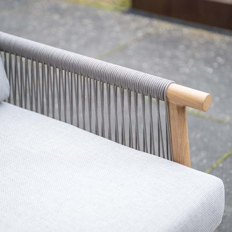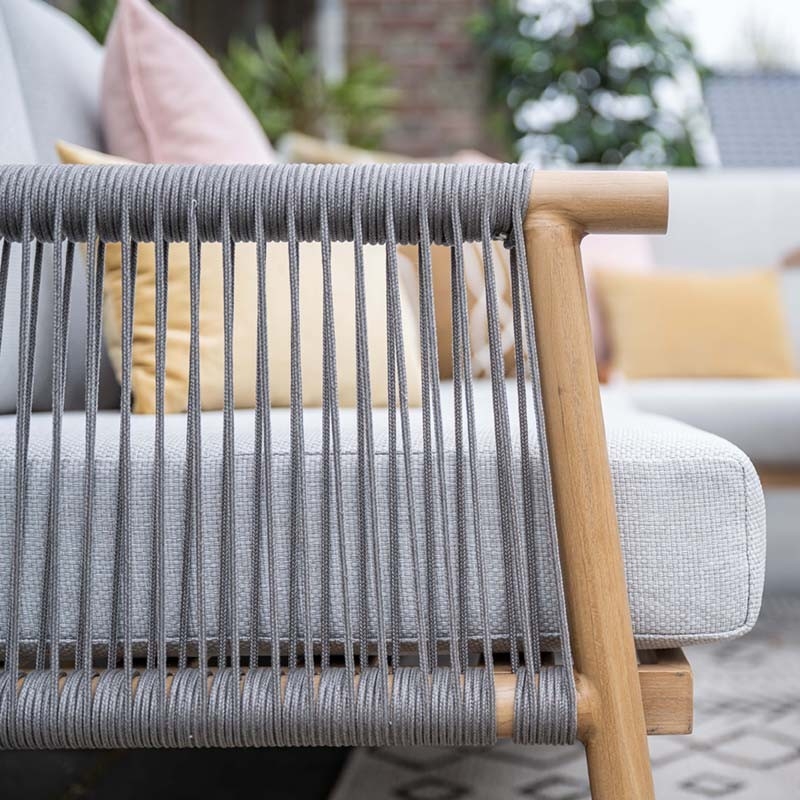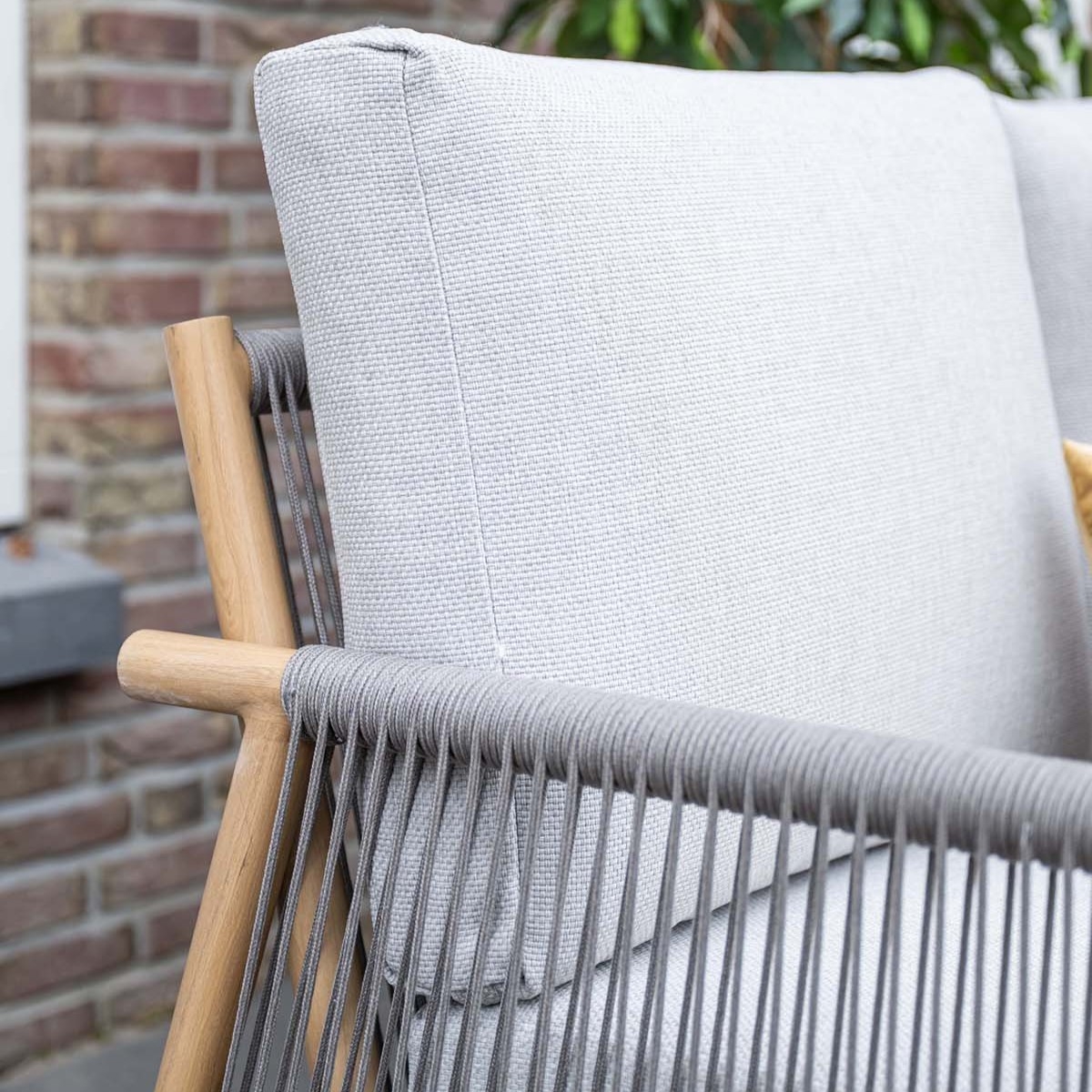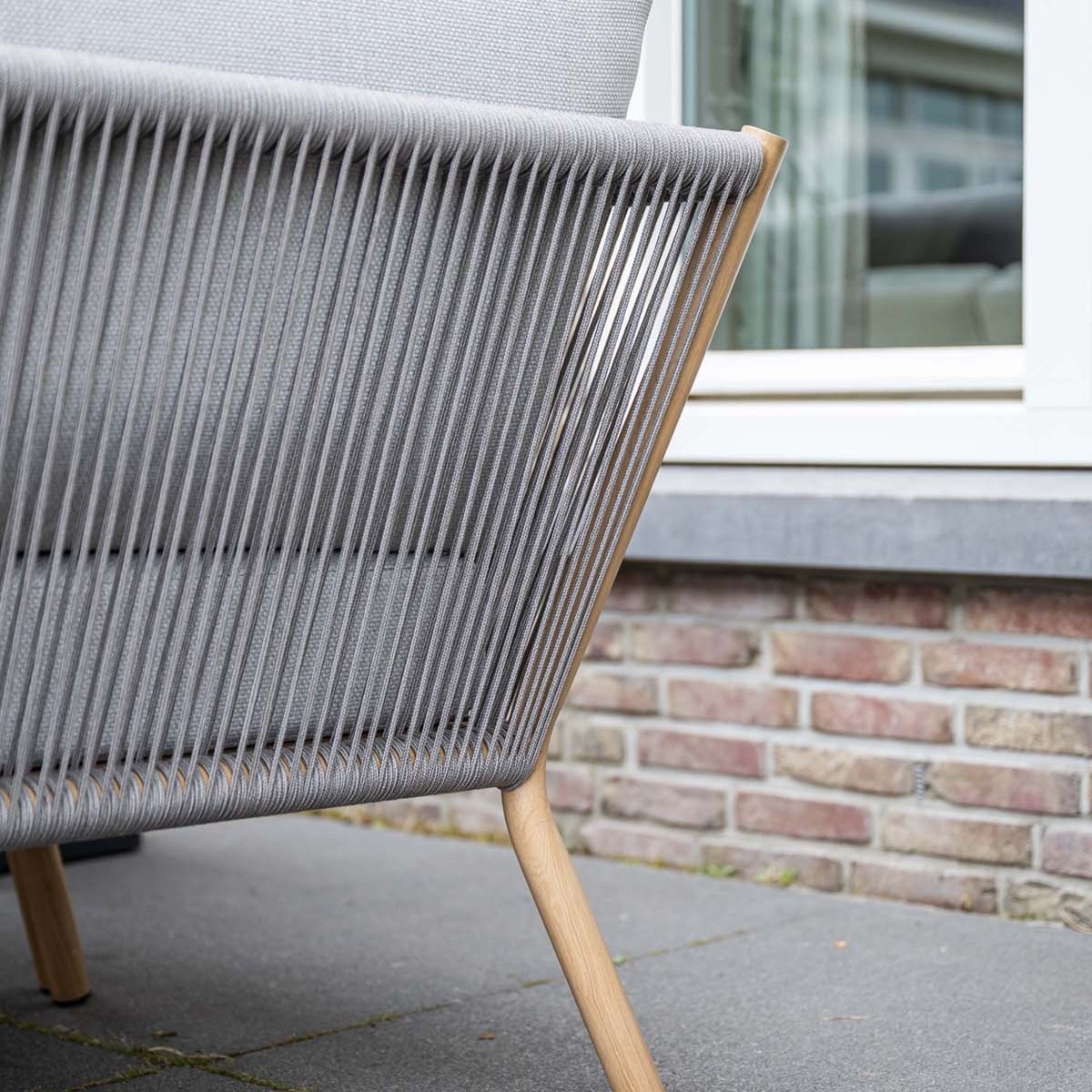 De armleuningen zijn afgewerkt met handgevlochten Qualicord, een duurzaam en stijlvol touwmateriaal dat zorgt voor een luchtig en modern accent. Deze combinatie van materialen geeft de set een exclusieve, eigentijdse uitstraling.