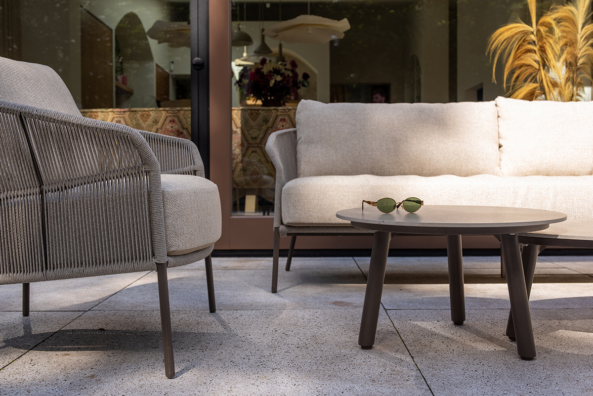Het gepoedercoate aluminium frame in de warme kleur Terre wordt stijlvol gecombineerd met verfijnd, handgevlochten rope in zand. Samen creëren ze een moderne en uitnodigende uitstraling die naadloos aansluit bij elke buitenruimte.