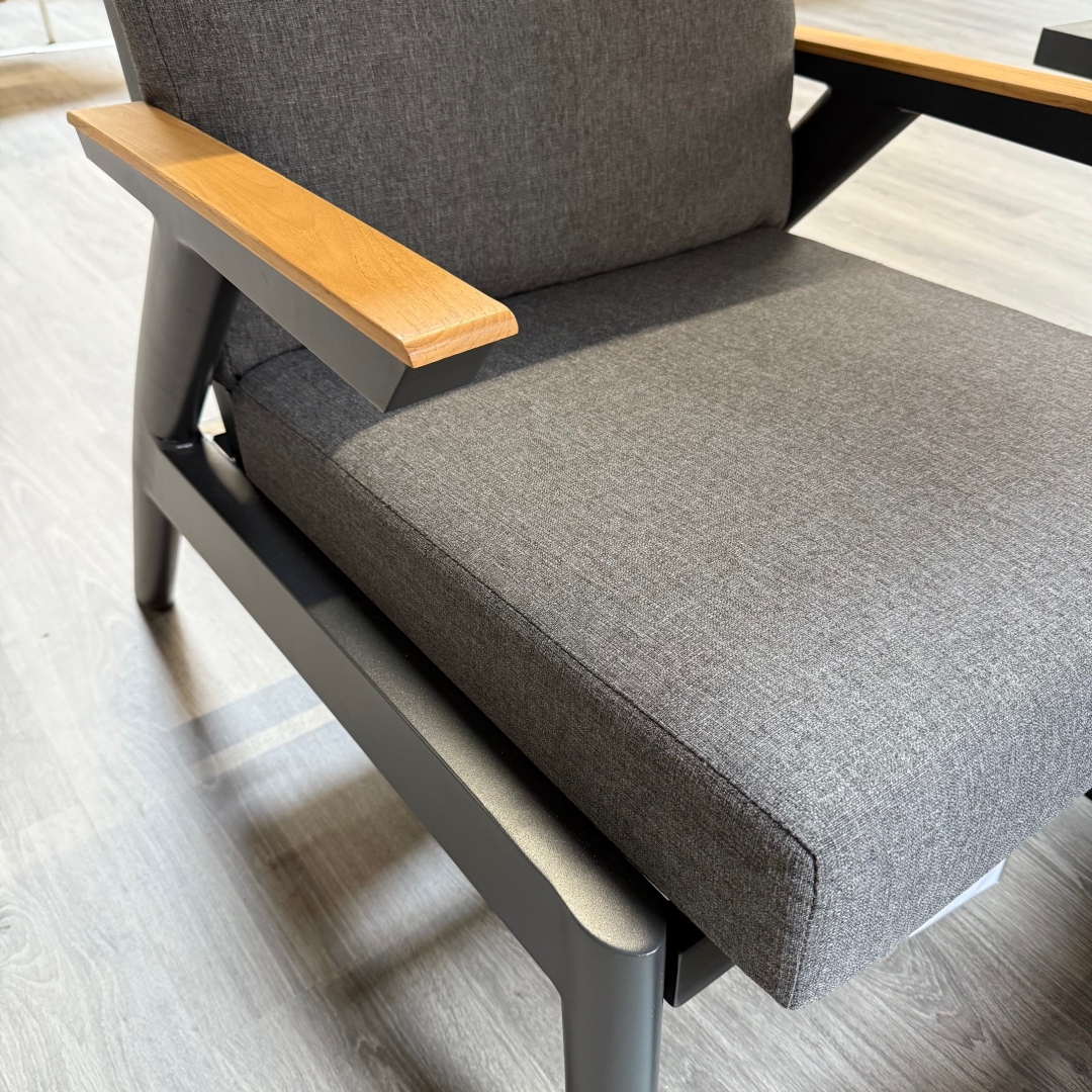 De hoge rug biedt extra comfort en ondersteuning, terwijl de teakhouten armleggers een warme, natuurlijke sfeer brengen.