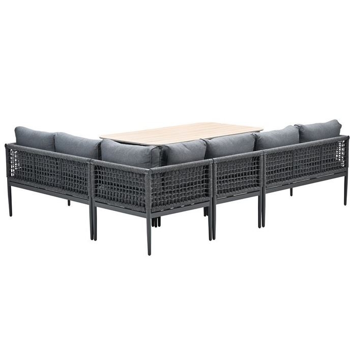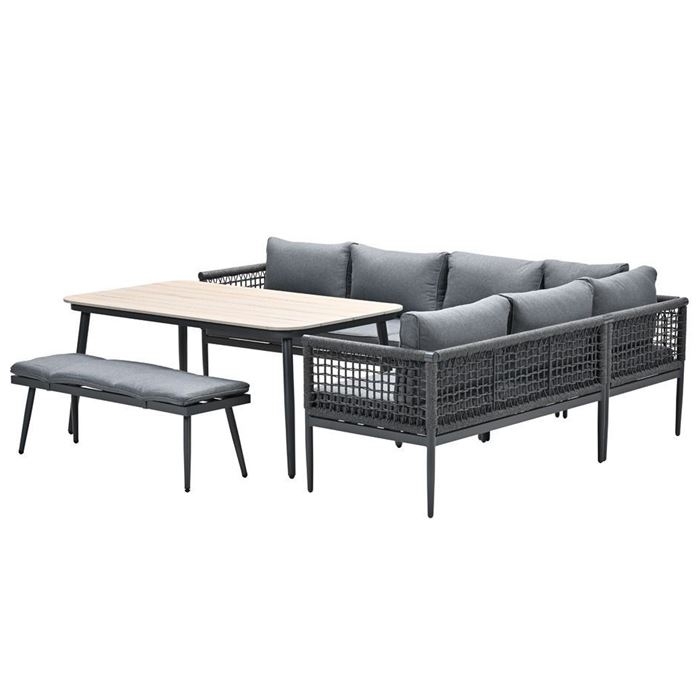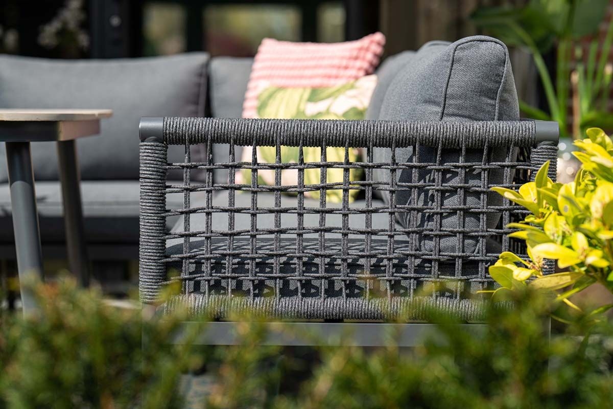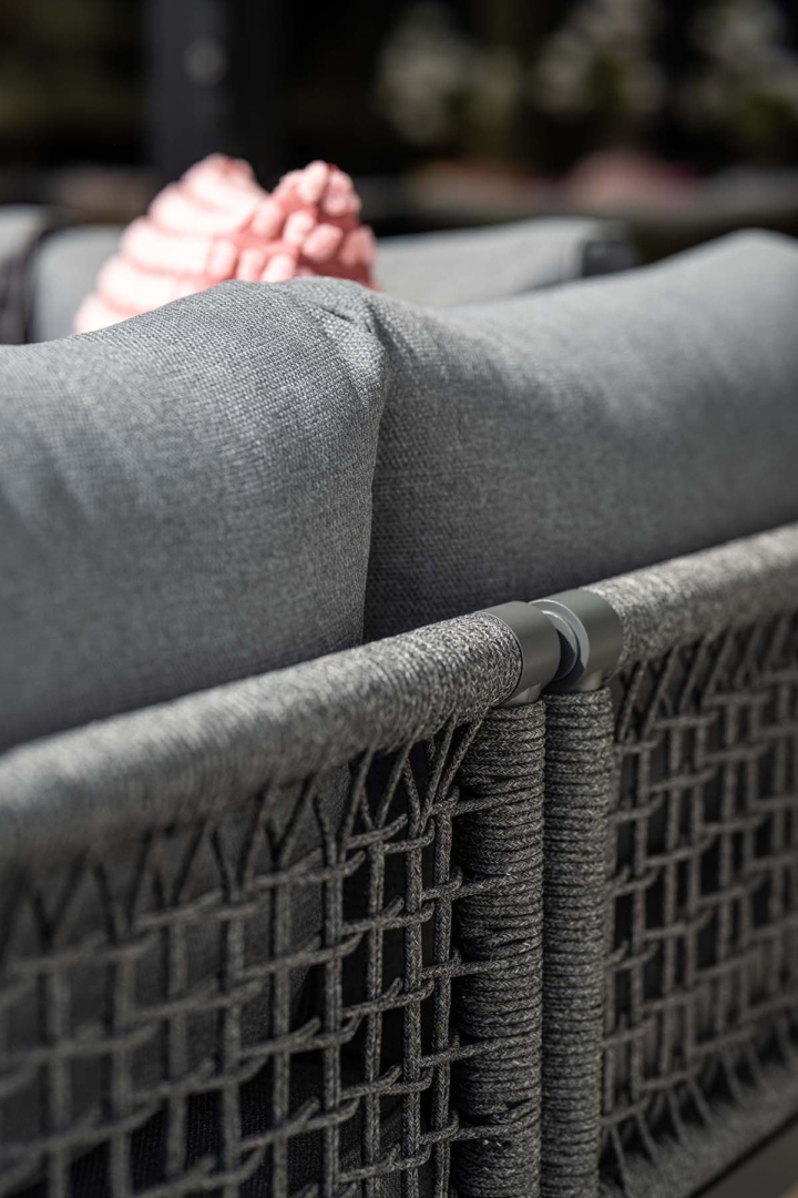 De Lausanne lounge diningset is verkrijgbaar in de kleuren rope dark grey met mystic grey gekleurde kussens en rope taupe en desert sand gekleurde kussens.