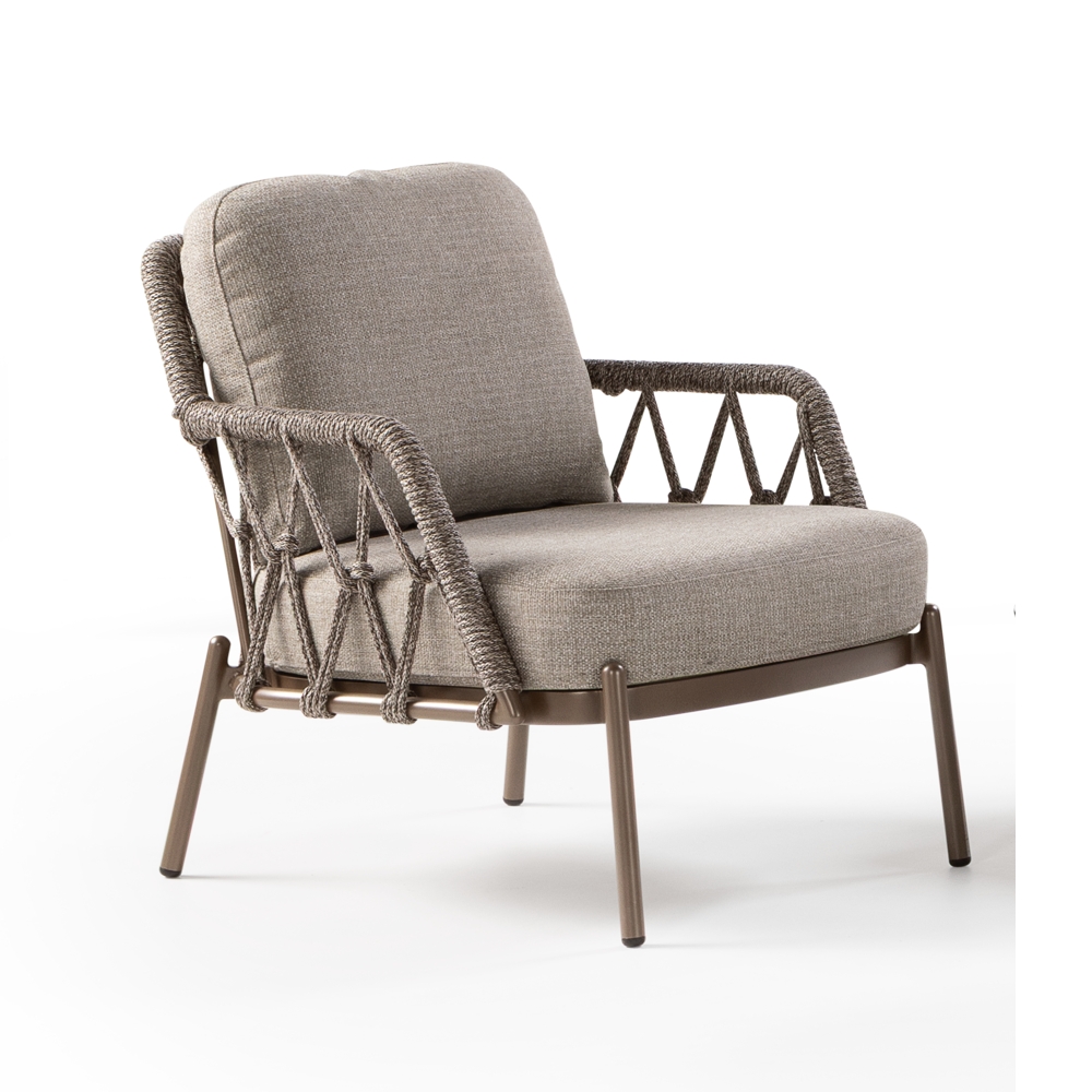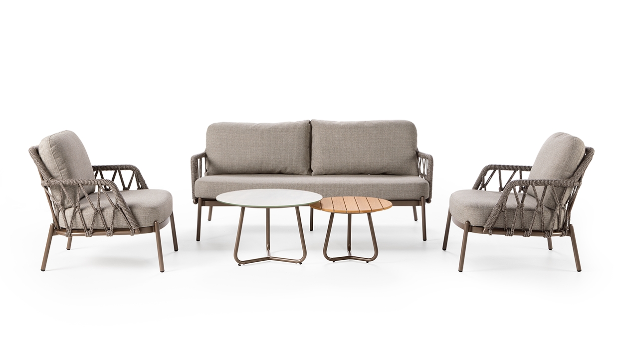 Het robuuste, gepoedercoate aluminium frame in de stijlvolle kleur coffee straalt tijdloze elegantie uit. De grove rope details geven de set een speelse en moderne twist.
