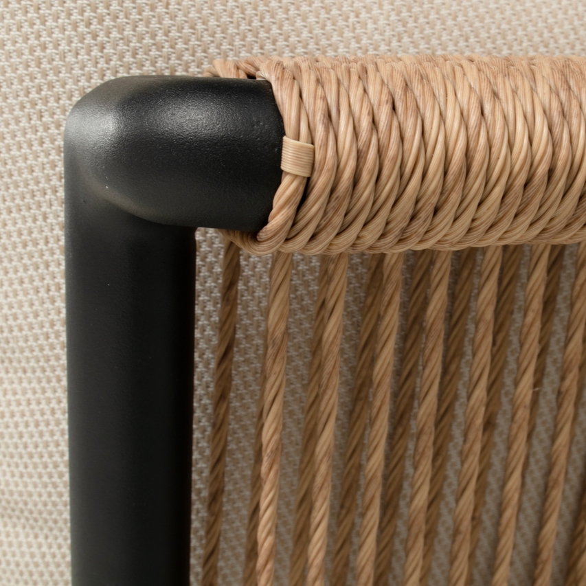 De strakke vormgeving wordt verzacht door het gebruik van gevlochten wicker, wat zorgt voor een warme en natuurlijke uitstraling.