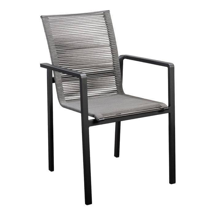 Stapelbare tuinstoel uitgevoerd met een zwart aluminium frame en donkergrijs rope.