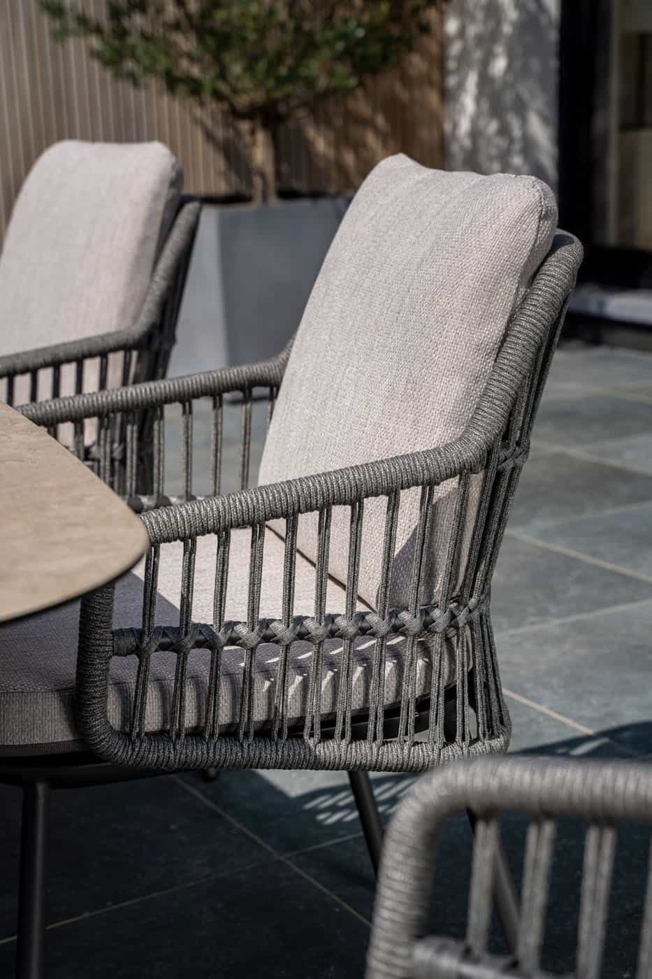 Het slanke, gepoedercoate aluminium frame vormt een prachtig geheel met het subtiel gevlochten rope. Deze combinatie geeft de stoel een eigentijdse én sfeervolle uitstraling die moeiteloos past bij diverse tuinstijlen.