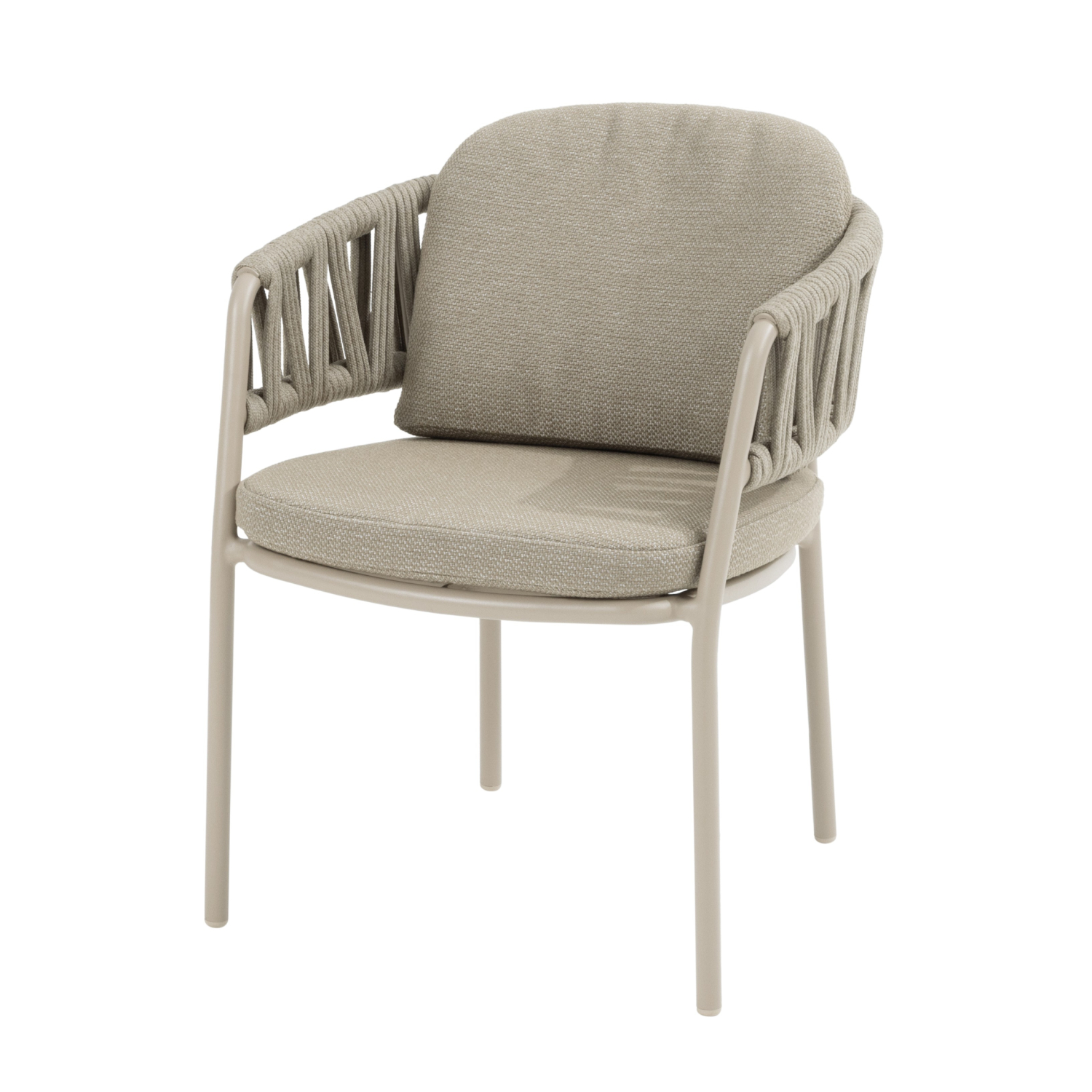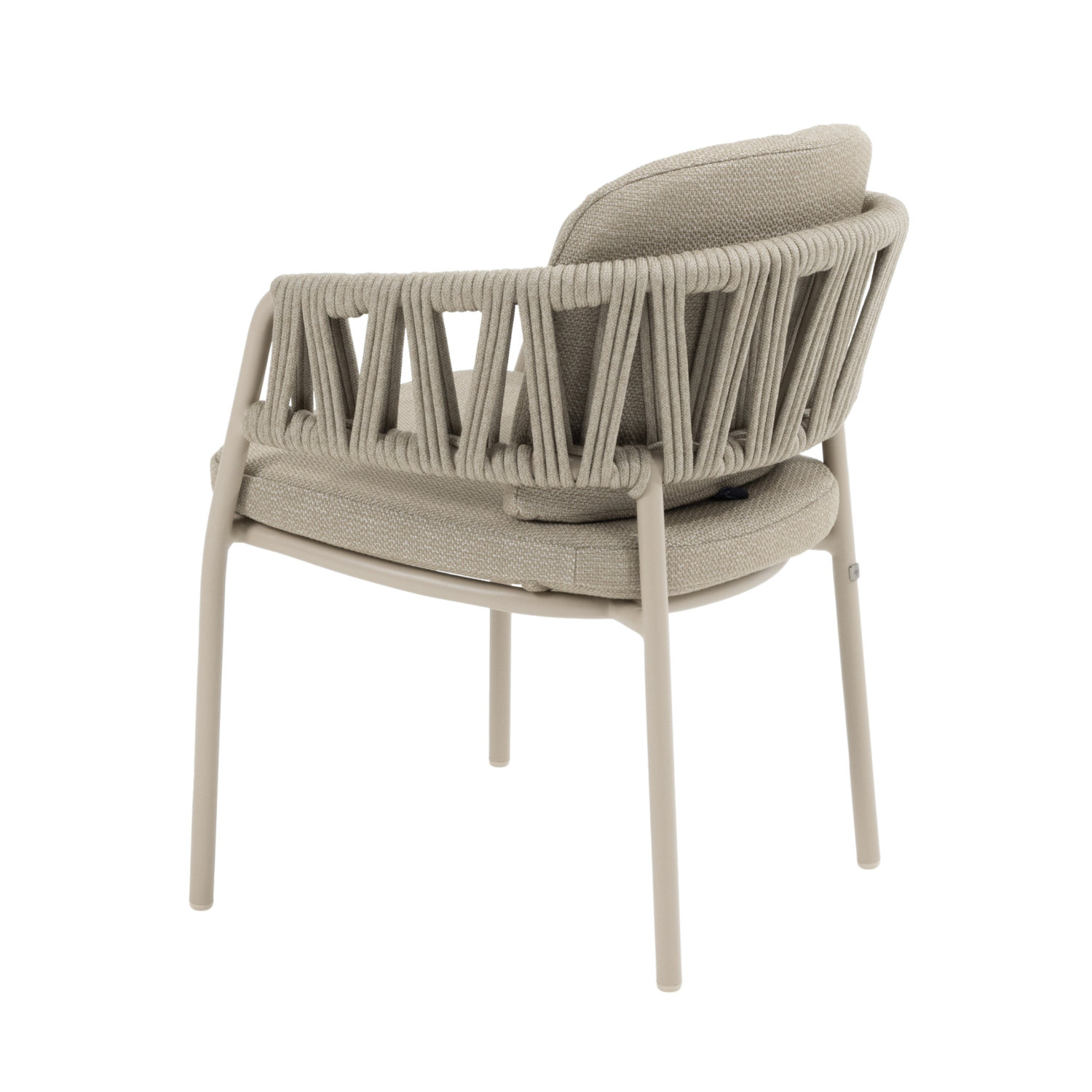 Het slank vormgegeven aluminium frame is gepoedercoat in de warme tint Latte en vormt een elegante combinatie met het subtiel handgevlochten rope in taupe. Samen geven ze de stoel een moderne, maar vooral uitnodigende uitstraling. De twee meegeleverde kussens zorgen voor direct zitcomfort, perfect voor lange en ontspannen diners in de buitenlucht.