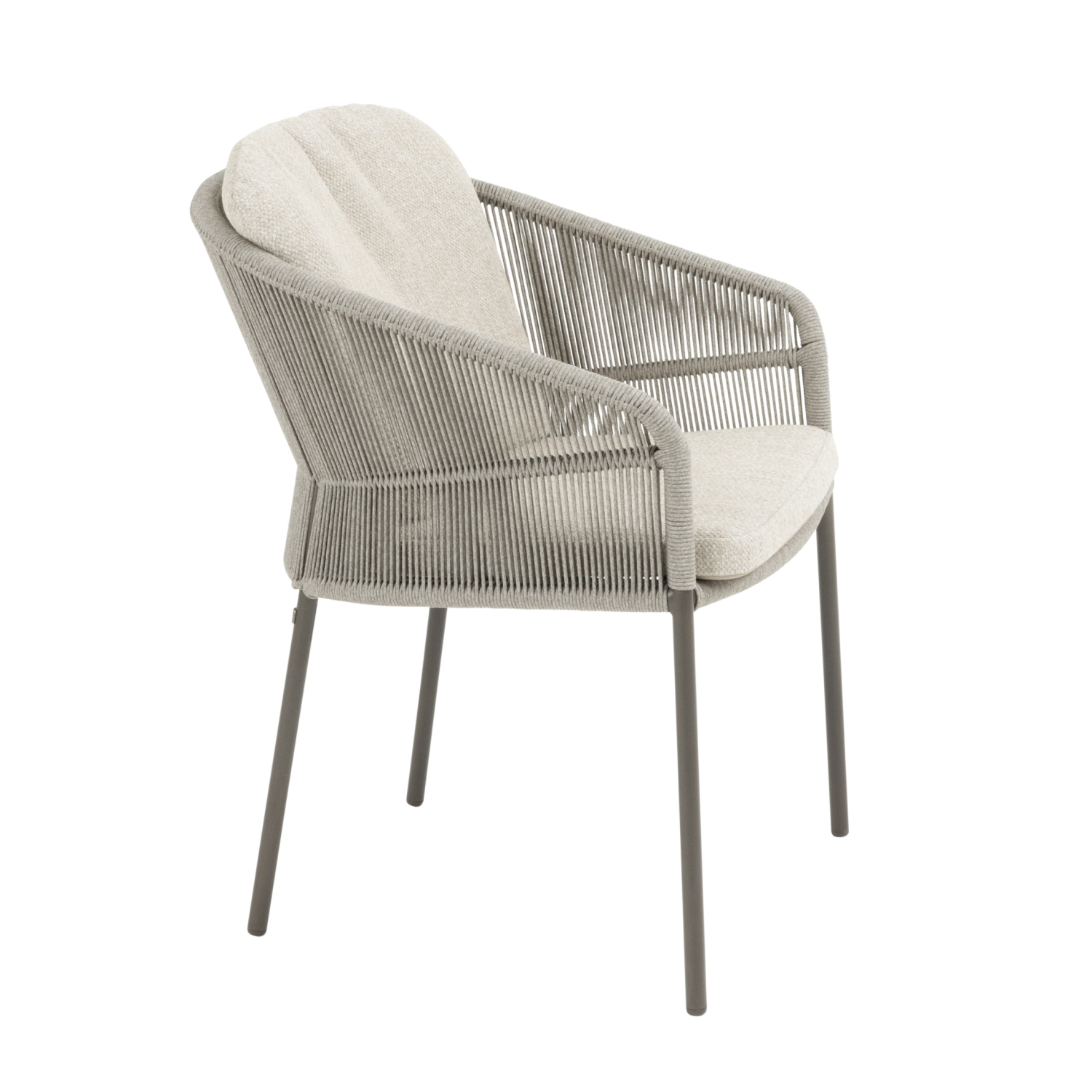Het slanke, gepoedercoate aluminium frame in een natuurlijke aardetint vormt een stijlvol contrast met het handgevlochten rope, wat de stoel een moderne en luchtige uitstraling geeft.