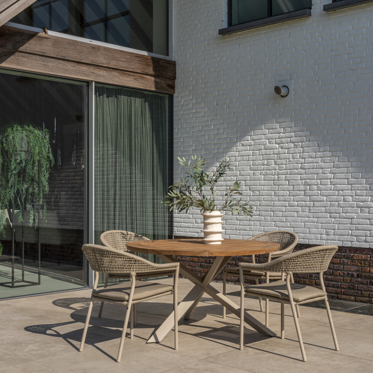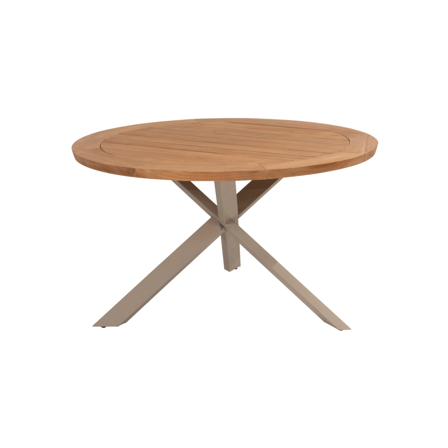 De subtiel afgeronde teakrand geeft de tafel een verfijnde afwerking en versterkt het luxe karakter. De combinatie van het natuurlijke teakhout met het latte-kleurige onderstel zorgt voor een warme, uitnodigende uitstraling die moeiteloos past in zowel moderne als landelijke buitenruimtes.