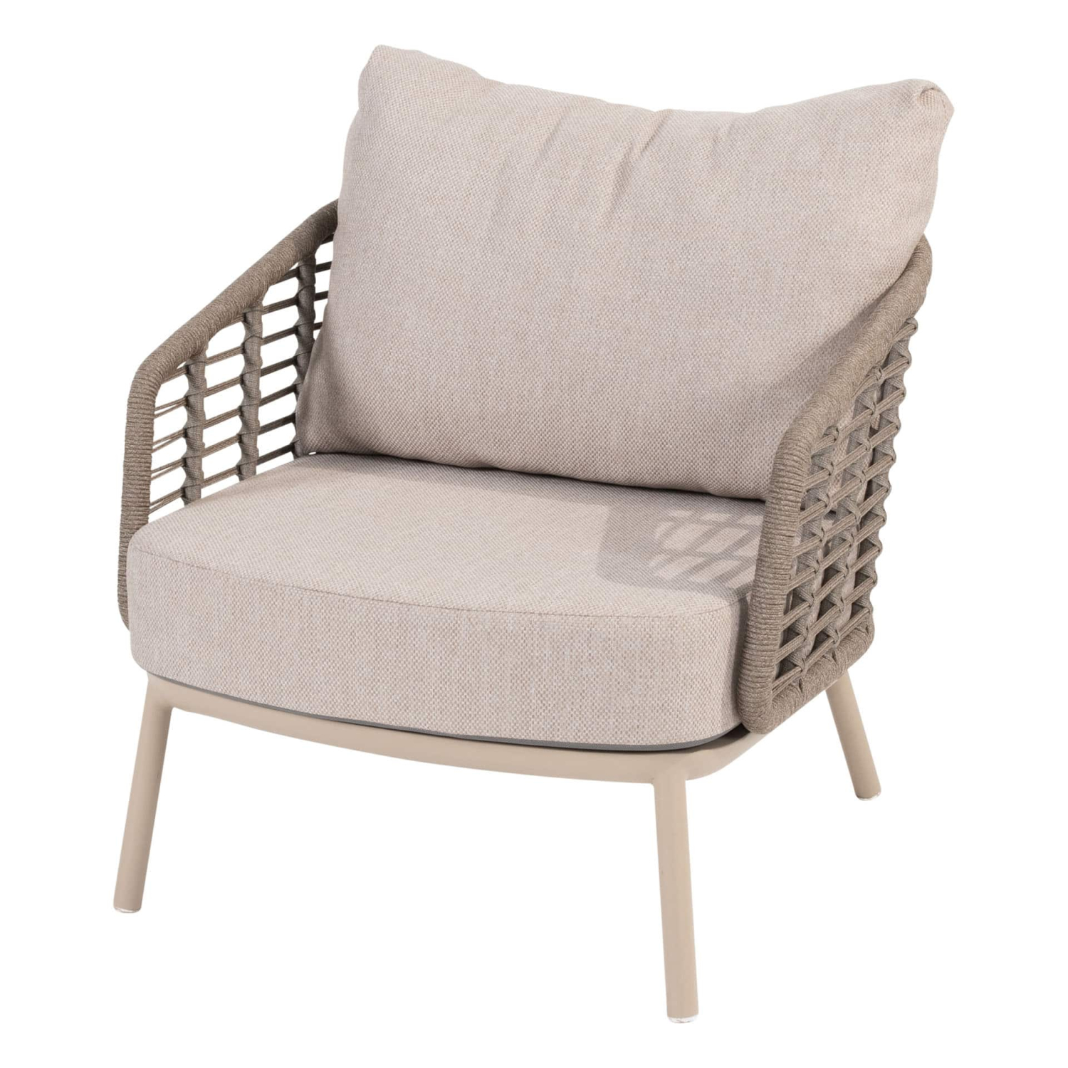 Om het frame zit touw geknoopt voor een eigentijds design. Het touw is zeer sterk en heeft een grote trekkracht. Het rope heeft een binnenkern van polypropyleen en een buitenkern van Olefin. Deze combinatie zorgt ervoor dat het rope water en vuil afstotend en schimmelwerend is. Het rope heeft een hoge UV bescherming en de stof wordt niet warm in de zon. Dit zorgt ervoor dat je prettig kunt zitten in de zon.